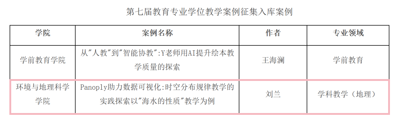 近日,全国教育专业学位研究生教育指导委员会秘书处公布第七届全国教育专业学位教学案例征集评审结果,我院刘兰副教授的教学案例《Panoply助力数据可视化:时空分布规律教学的实践探索——以“海水的性质”教学为例》,成功入选中国专业学位教学案例中心案例库。此前,我院王慧敏副教授负责开发的《自然灾害教学:如何自主单元?》也曾于2022年成功入选。