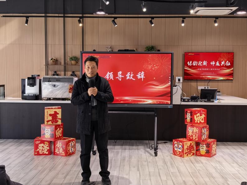 茶话会伊始,主持人赵杰老师、孙雨涵老师用热情洋溢的开场白拉开了活动序幕。院党委书记周新荣老师代表学院致辞,既充分肯定了学院过去一年在各项工作中取得的优异成绩,也为新一年的发展方向作出明确指引,话语间满含对学院发展的殷切期望与对教职工的深切关怀,让在场每一位教职工备受鼓舞。院长卢松教授带领大家一同回顾了过去一年全院教职工携手拼搏、硕果累累的奋斗历程,同时展望了学院新一年策马扬鞭、再创辉煌的美好前景。