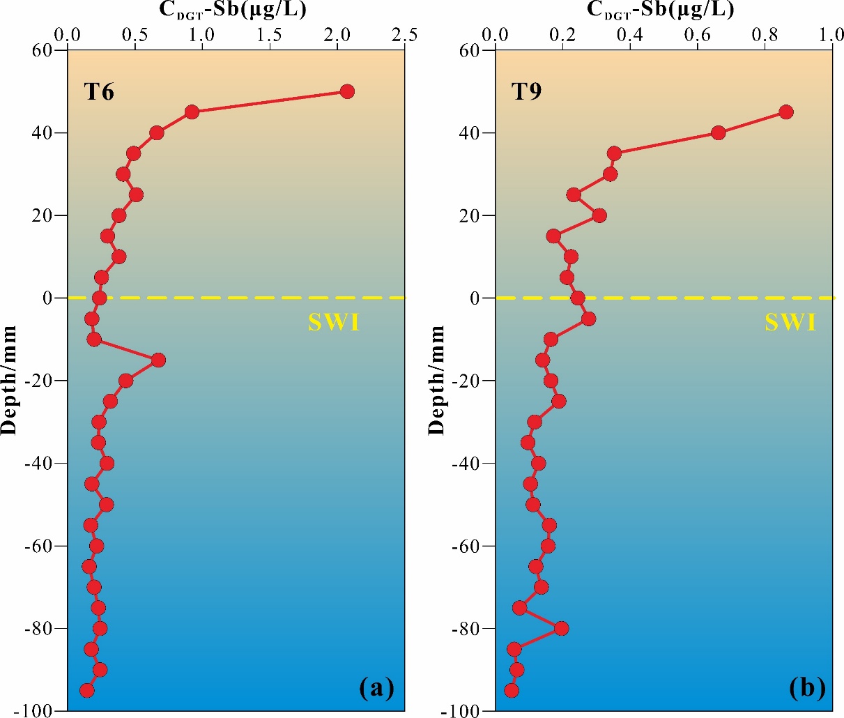 图1 (a) T6站点和(b) T9站点处DGT有效态锑的分布模式