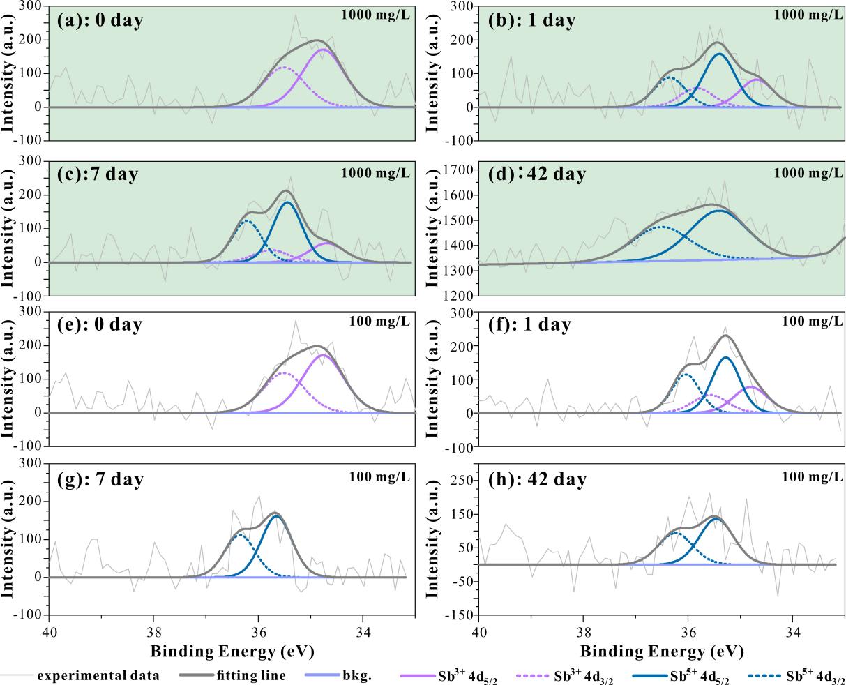 图2沉积物中锑价态的时序变化特征。(a)-(d)为1000 mg/L锑浓度组。(e)-(h)为100 mg/L锑浓度组