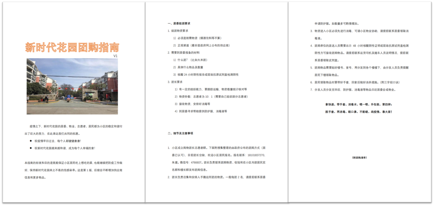 基于课题组的前期成果,朱建教授以学者的严谨态度,居家连夜编写出22页的《新时代花园团购指南》,在征得居委会同意后,第一时间发布在小区业主群。据悉,发布当天就成团4个,服务上千人次,涵盖蔬菜、肉、鸡蛋、海鲜等物资。参与团购的住户们纷纷对朱教授表达谢意,并请他一定把这份感谢转达给上师大研究生们。