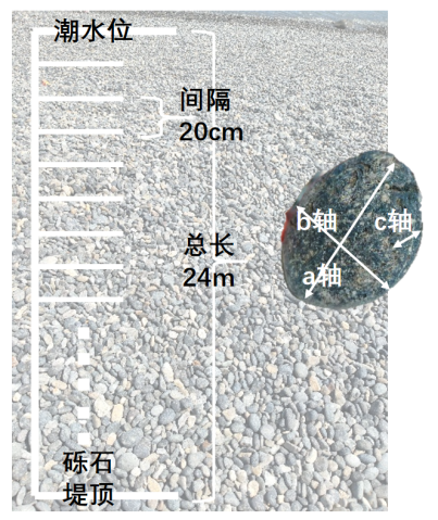 在叶程程老师的指导下,同学们用卷尺测量了离海洋不同距离的卵石的长、宽、厚度。经过仔细的测量与分析,我们发现了一个有趣的现象:这里的卵石大小变化还标志着潮线的位置。从砾石堤顶部向海的方向,砾石粒径呈现出递减的趋势;然而,当接近大潮低潮线时,砾石粒径又有所增大。也就是说,粒径大小突变的拐点,在平均大潮低潮线的位置。