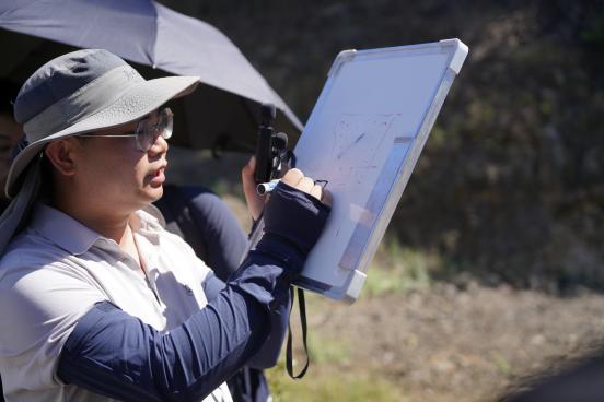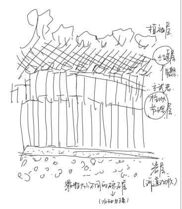 叶程程老师为大家讲解了玄武岩柱状节理下方的临空面和沉积层。该区域曾为河流谷地,河流长期冲刷玄武岩底部,形成临空面。洪水期河流流速快,搬运粗颗粒物质(砾石、粗砂)沉积于河床,形成下层河床相冲积层。枯水期河流退缩至主槽,漫滩区流速减缓,细颗粒物质(粉砂、黏土)沉积于上层,形成河漫滩相冲积层——上下两层粗细颗粒的垂直叠置,构成典型的河漫滩二元结构。另外,同学们还观察了红壤A、B、C和R层的剖面结构,发现土壤层比较浅薄,这与地形位置较高、地表径流侵蚀、土壤颗粒发生迁移有关。