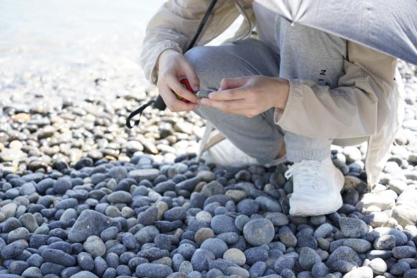 在东沙海滩,同学们对比观察了砾石滩和沙滩的不同。东沙海滩的沙子主要源于朱家尖岛周边岩体的风化碎屑,在海浪的长期搬运过程中,一方面海浪对颗粒进行磨圆,另一方面通过分选作用,使细小颗粒在海浪能量较弱的区域沉积,最终形成了沙滩。