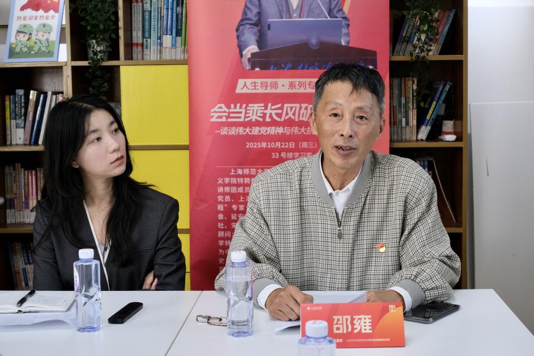 为纪念中国人民抗日战争暨世界反法西斯战争胜利80周年,进一步深化青年学生对党史与精神谱系的系统性理解,激发新时代青年坚定初心使命、勇担时代重任的责任感与行动力,10月22日下午,环境与地理科学学院联合哲学与法政学院,在奉贤校区33号楼学习家活动室共同举办“会当乘长风破万里浪”人生导师主题沙龙活动。活动特邀人文学院教授、博士生导师邵雍担任主讲嘉宾,哲法辅导员窦美霖主持活动,环地辅导员康霓出席活动。
