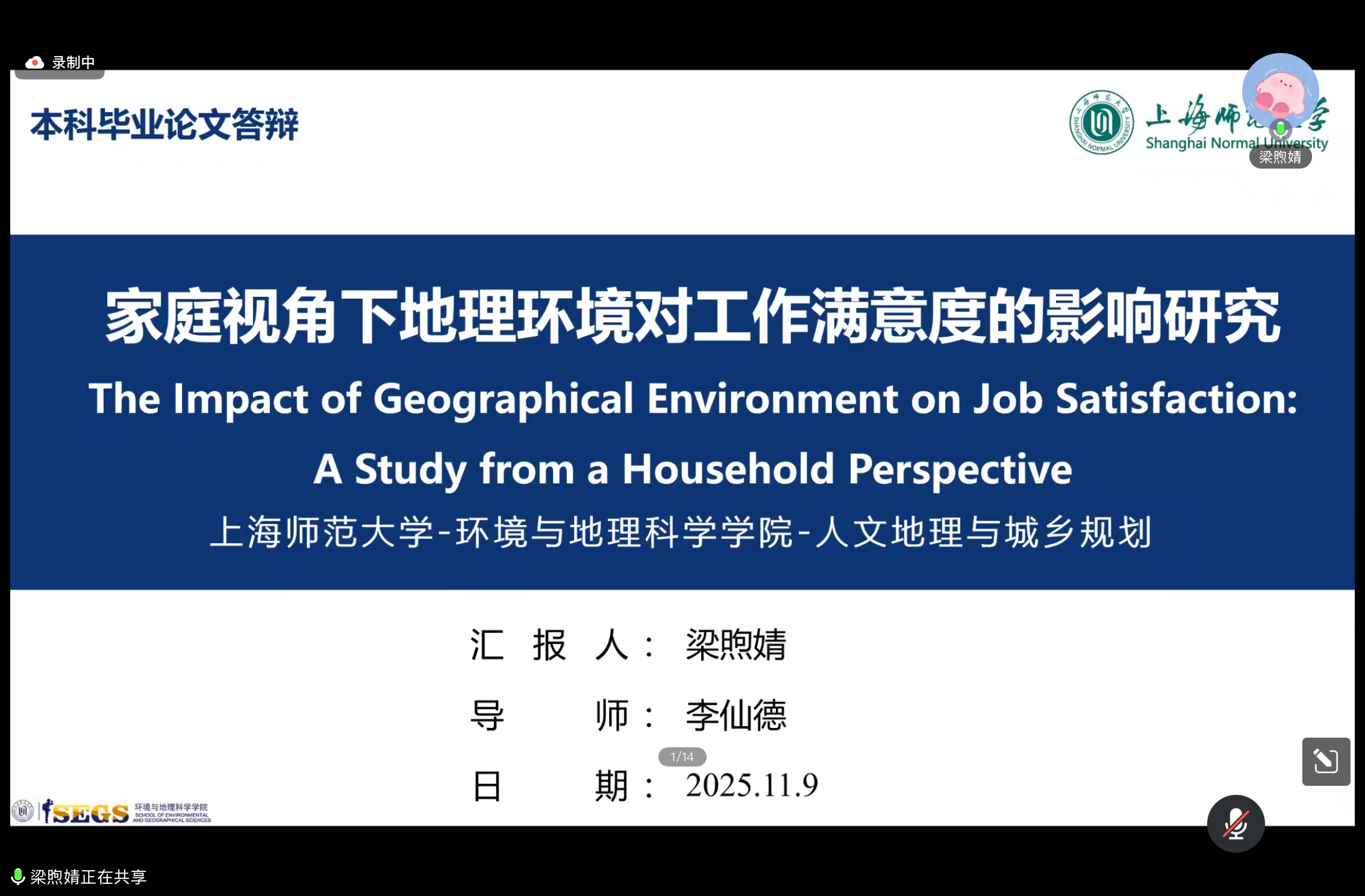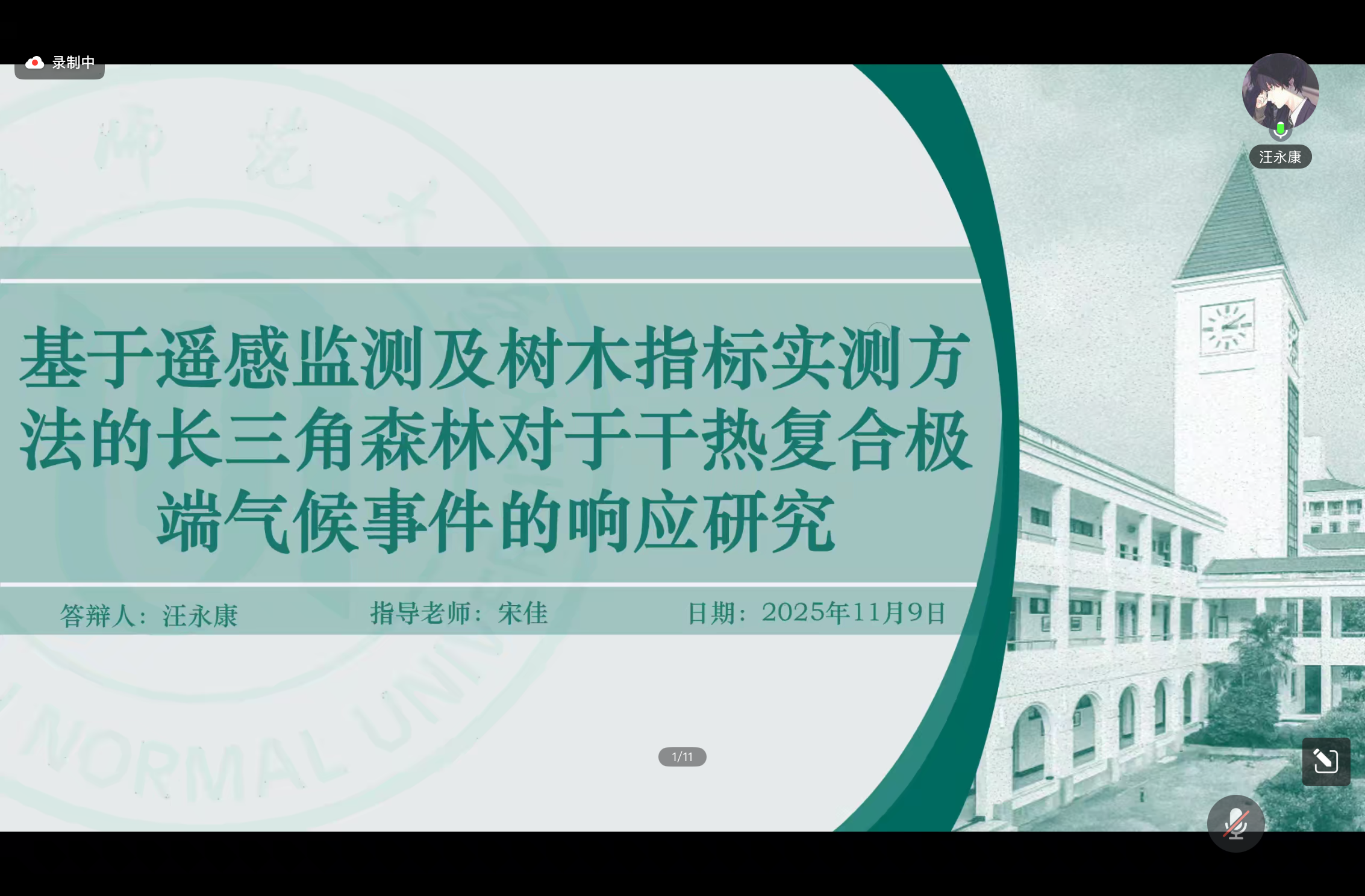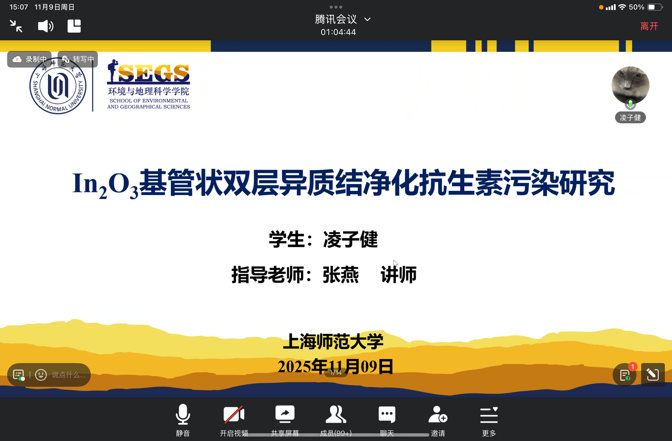 地理科学(师范)专业毕业生汪永康同学以《长三角森林对干热事件的响应研究》为题,构建综合干热指标,结合遥感与实地数据,分析2022年及近二十年干热事件的时空特征,评估不同树种在极端条件下的生理响应差异及结构性特征。地理信息科学专业毕业生陈提同学在《基于深度学习的长三角水体识别》研究中,提出一种新型水体标签生成算法,缓解样本短缺问题,并采用“双教师知识蒸馏”U-Net模型,增强模型的泛化能力与自动化水平。人文地理与城乡规划专业毕业生梁煦婧同学从家庭视角出发,基于2016、2018年中国劳动力动态调查数据,探讨地理环境、交通通勤及社会人口因素对工作满意度的直接与间接影响,并分析夫妻间关系在其中的作用。环境工程专业毕业生凌子健同学聚焦抗生素污染问题,在《氧化银-硫化锌异质结光催化降解抗生素》中成功制备管状异质结材料,系统评估其在可见光下对四环素的降解性能。