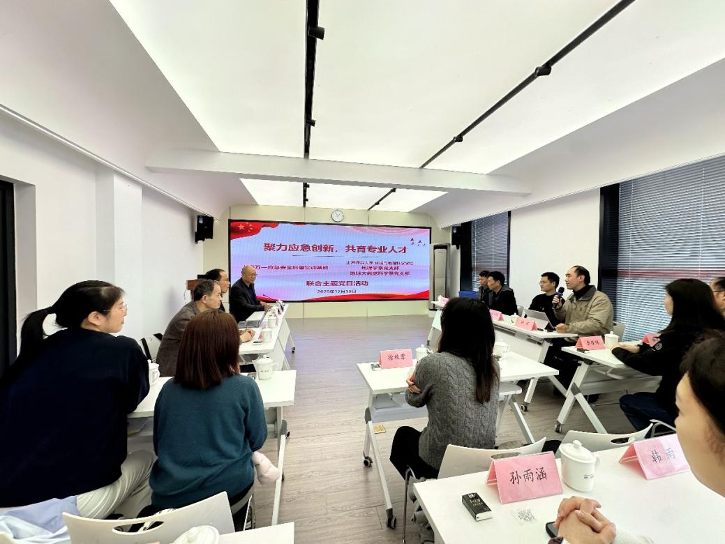随后,学院周新荣书记、杜士强副院长、地球大数据科学系教工党支部书记於家教授、地理学系教工党支部温家洪教授和张敏教授等分别介绍了此次调研主题与学院相关教学与科研工作开展情况,并围绕AI时代地理教学、应急管理、新专业申报等方面与基地人员展开讨论。周新荣书记在总结发言时强调,学院在贯彻落实上海高等教育“一校一策”综合改革中,将聚焦韧性城市与防灾减灾方向,高度重视师生安全素养培育,此次组织党支部师生走进实训基地,既是落实总体国家安全观的具体举措,也是推动党建工作、实践教学创新和微专业培育深度融合的重要尝试。希望通过此次交流,探索双方在教学实训实践、应急科普、研究项目等方面的合作可能。